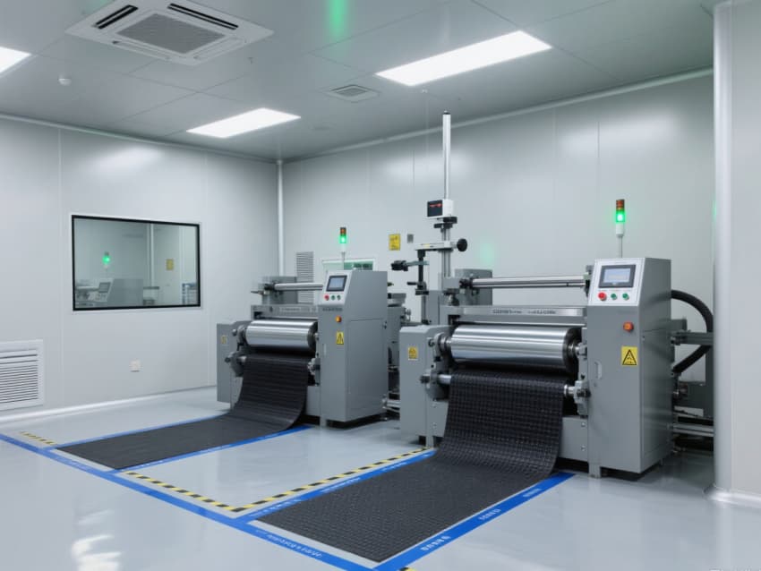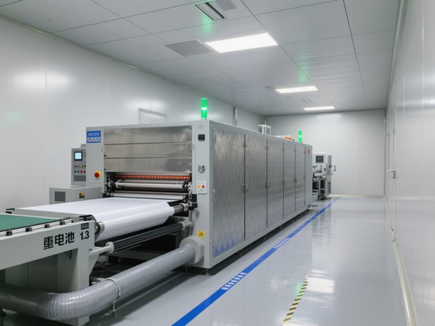 車間以銀灰色抗菌金屬彩鋼板搭建墻體與吊頂,搭配淺灰色防靜電環(huán)氧地坪,金屬質(zhì)感的建材兼具抗電解液腐蝕、易清潔特性,地面藍(lán)色防靜電標(biāo)識線清晰劃分涂布、卷繞、裝配等工序區(qū)域。頂部高效過濾器與定向?qū)恿飨到y(tǒng),實現(xiàn)每小時18-22次空氣置換,配合除濕機(jī)組將濕度精準(zhǔn)控制在20-30%RH,避免水分影響電芯性能。?