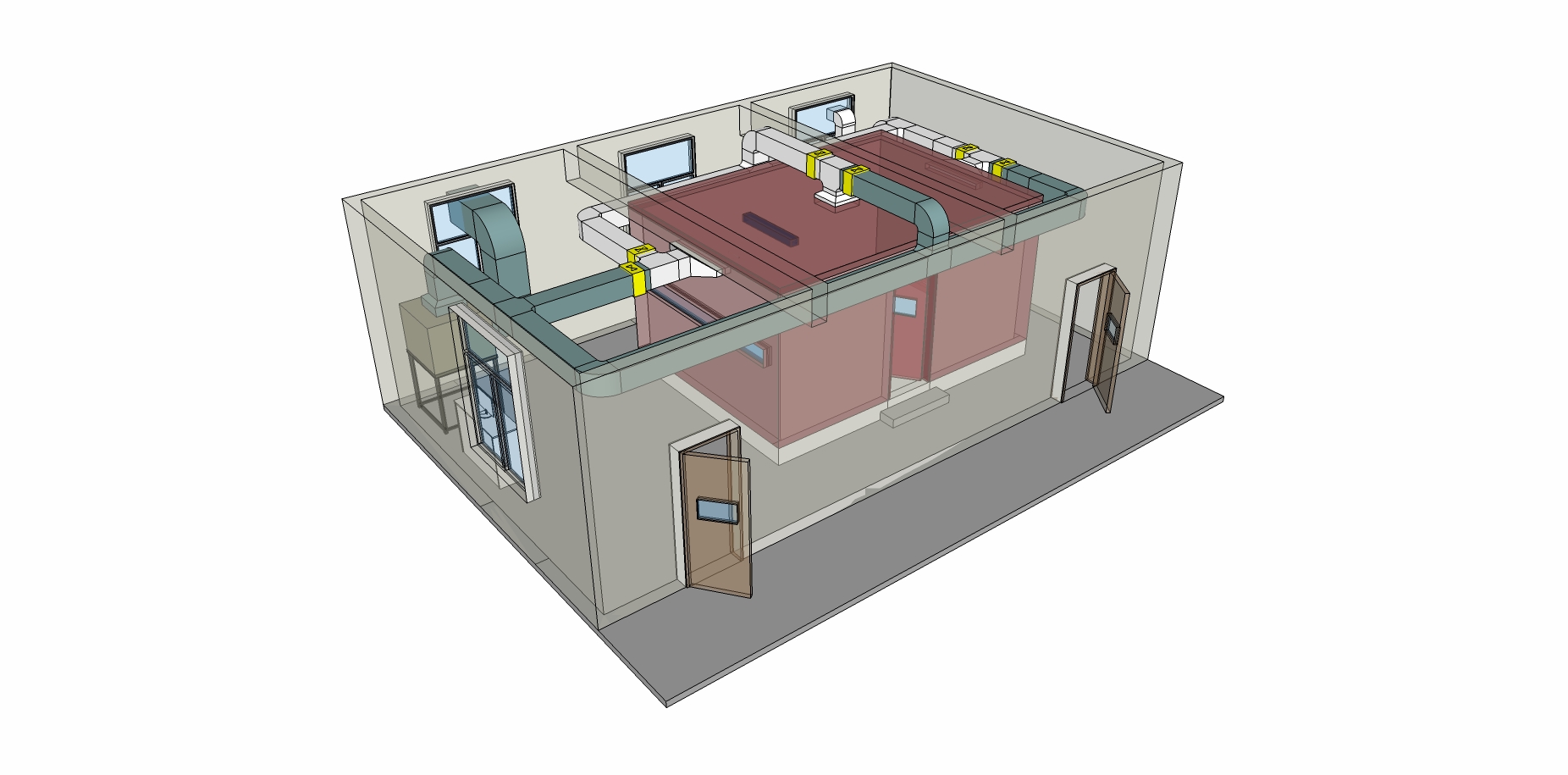 實驗室分為外室和內(nèi)室兩部分。內(nèi)室為主要的實驗平臺,放置呼吸暖體假人和VOAG,通過外室的空調(diào)系統(tǒng)、恒溫恒濕系統(tǒng)向內(nèi)室送入恒定溫度和濕度均勻的新風,提供恒定的溫濕環(huán)境,整套系統(tǒng)采用全進全排的方式,不回風。外室放置空調(diào)機組、恒溫恒濕機柜。